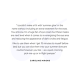 Enriched with moisture boosting Rosewater, Glycerin, Hyaluronic acid and Panthenol, the skin around the eye area is instantly plumped and hydrated. To support skin barrier function and to soothe and calm the skin, Squalane, Ceramides, Cholesterol and plant extracts work in synergy. Collagen boosting peptides act as signallers for new collagen formation, whilst the Caffeine and Niacinamide work to reduce dark circles and under eye fatigue.